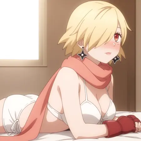 FumikoNinja, 스카프, 빨간 스카프, 비키니 상의, 흰색 비키니, 손가락 없는 장갑, 어깨 노출, 가슴 선, 앞쪽 매듭 상의, 허벅지 길이 양말,