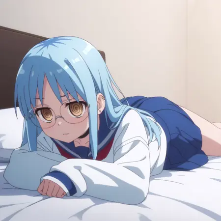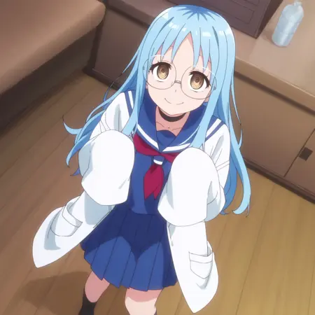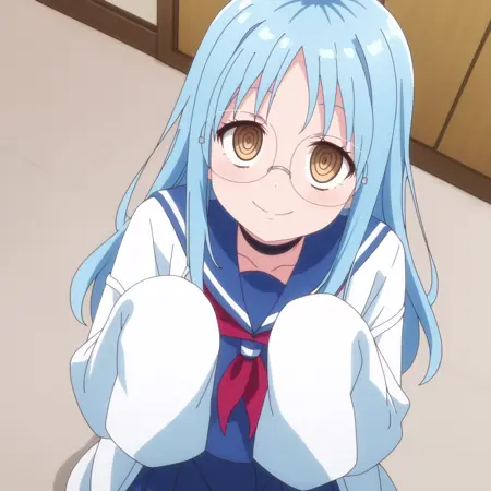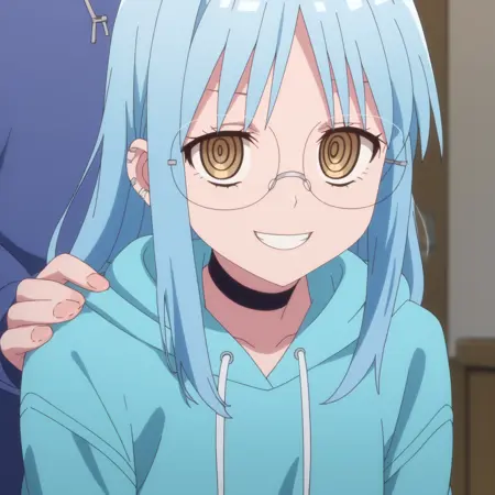 ANAMinato、長い髪、青い髪、眼鏡、前髪、茶色い目、髪の下に見える眉毛、黒枠の眼鏡、