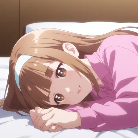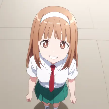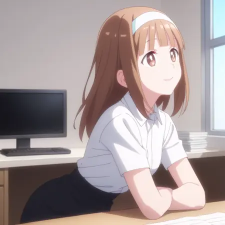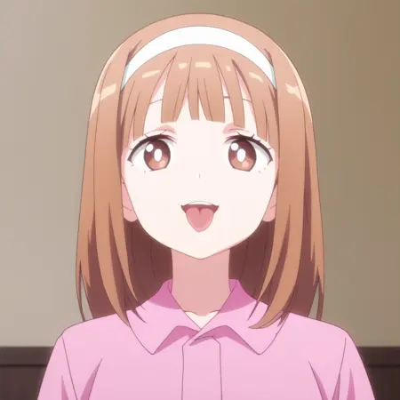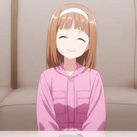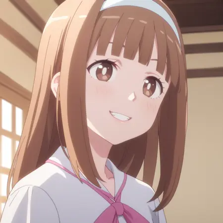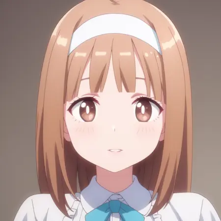 ANAAiko, brown hair, long hair, hairband, bangs, white hairband, blunt bangs, brown eyes, eyebrows visible through hair, medium hair, headband,