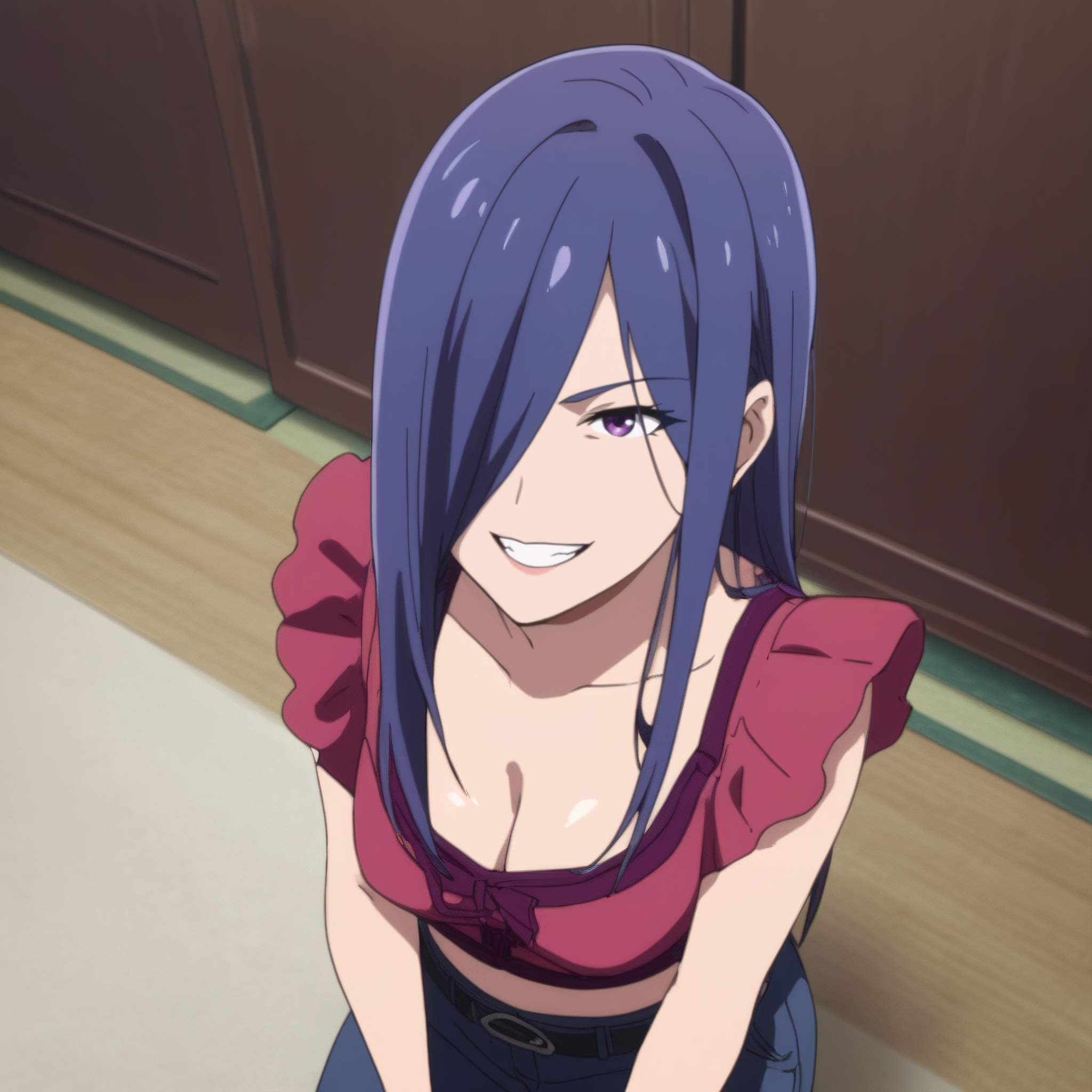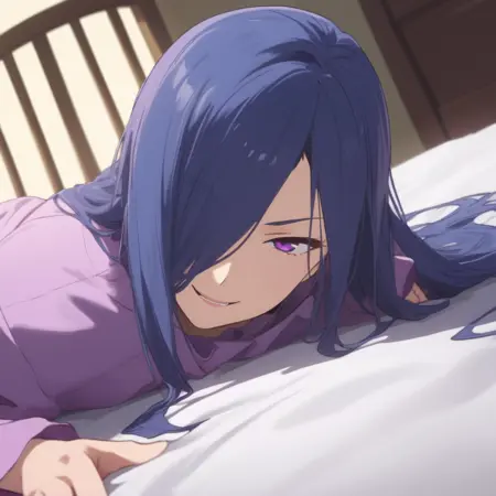 AMWMorii, long hair, blue hair, hair over one eye, purple eyes, bangs,