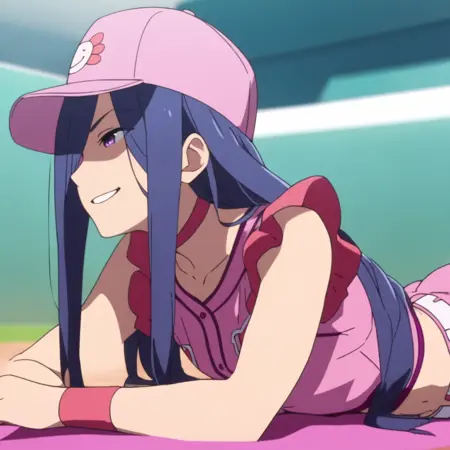 MoriiBaseball, hat, pink headwear, pink shirt, choker, collarbone, midriff, pink shorts, shirt, navel, belt, wristband,