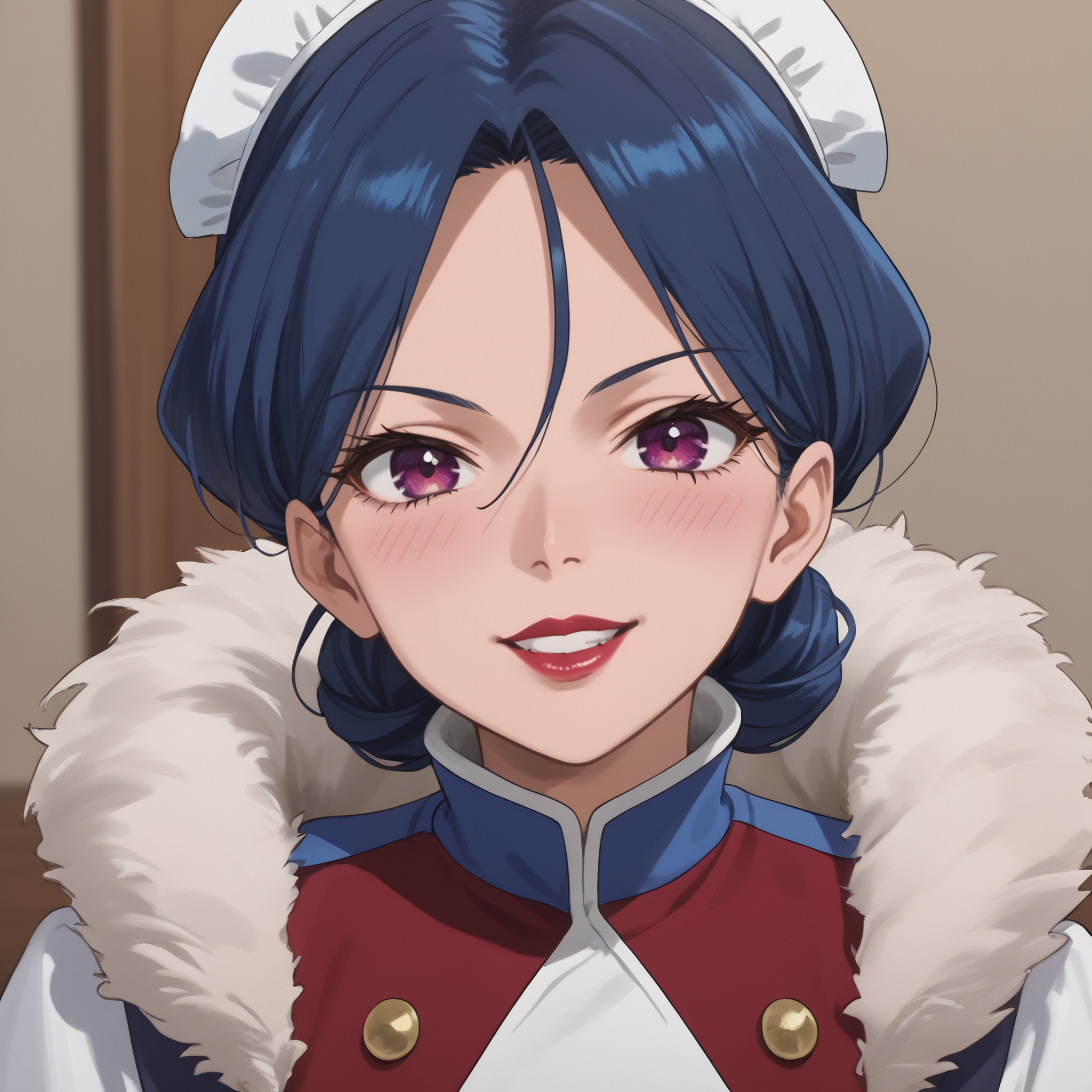 AMWMinori,紫色眼睛,蓝色头发,发髻,折叠马尾,刘海,头发遮住眼睛,睫毛,口红