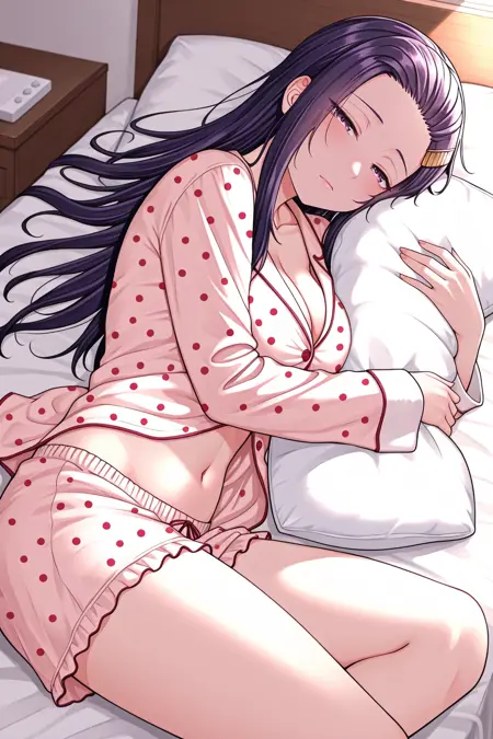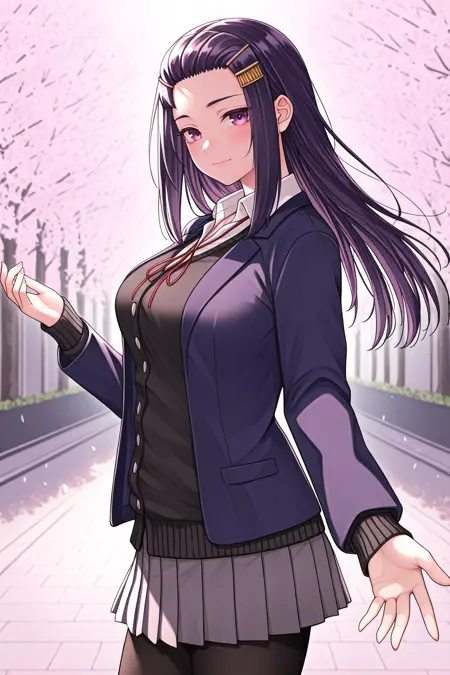 秋野さゆり、紫の目、紫の髪、長い髪、ヘアクリップ、ヘアオーナメント、後ろでまとめた髪