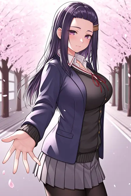 濃い青のジャケット、黒のカーディガン、ネックリボン、赤いリボン、シャツ、取り外し可能な襟、制服、グレーのスカート、ミニスカート、プリーツスカート、黒のパンティーストッキング、開いたジャケット