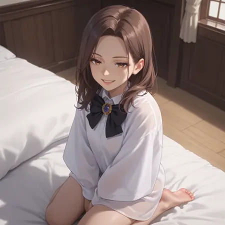 AMWMichiyo、長い髪、リボン、分け目のある前髪、茶色の目、ネクタイ、前髪、リボン、茶色の髪、黒いリボン