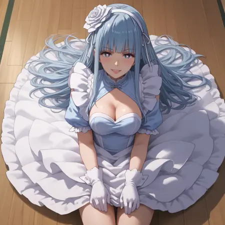 AMWManami,长发,刘海,齐刘海,发饰,蓝发,发花,丝带,发带,头发下可见眉毛,蓝眼睛,发带,
