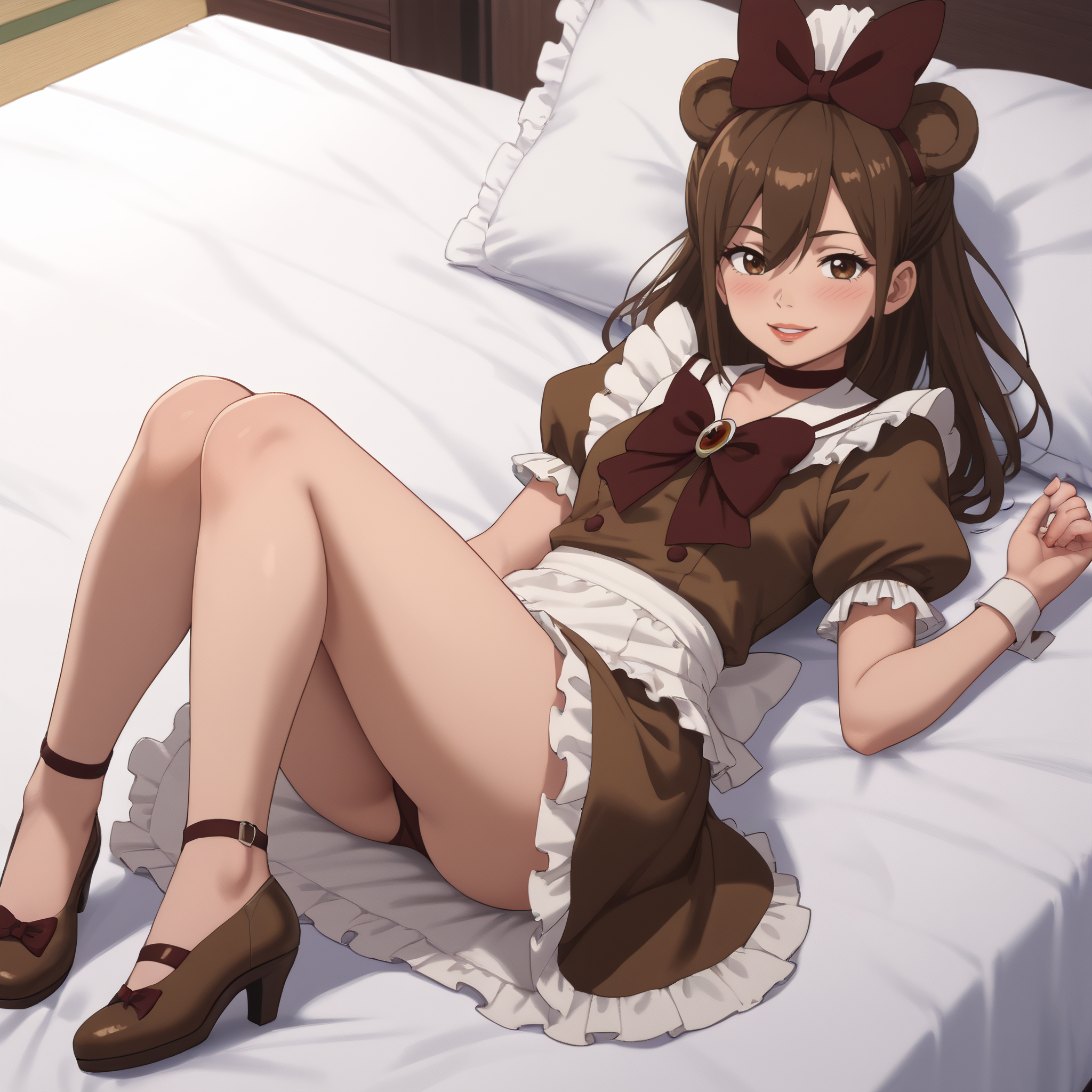 AMWBearExecutive,蝴蝶结,棕色头发,棕色蝴蝶结,棕色眼睛,发饰蝴蝶结,长发,领结,丝带,头发位于眼睛之间,棕色领结,动物耳朵,红色丝带,
