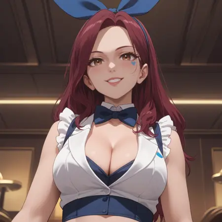 AMWCardDealer, long hair, bow, bowtie, hairband, ribbon, red hair, animal ears, hair ribbon, rabbit ears, eyelashes, brown eyes, ponytail,