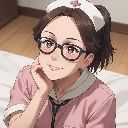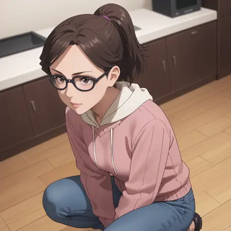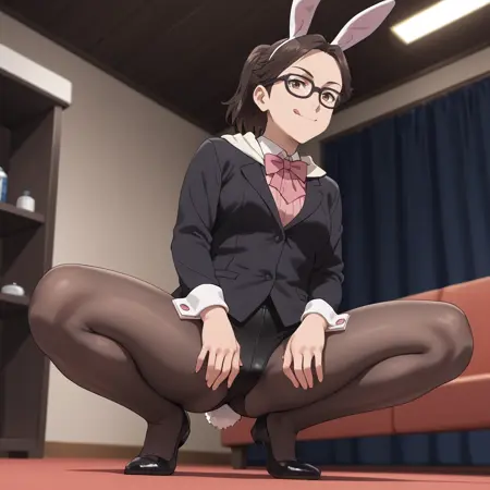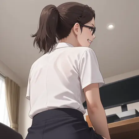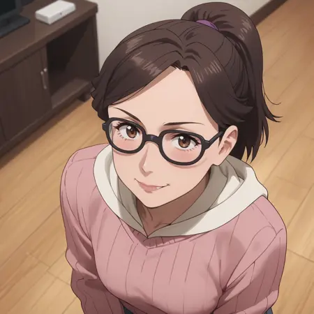 ARTMitsuko、茶色の髪、短い髪、眼鏡、黒枠の眼鏡、ポニーテール、不透明な眼鏡、前髪、髪を後ろにまとめた、茶色の目、茶色枠の眼鏡、髪留め、