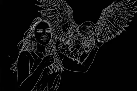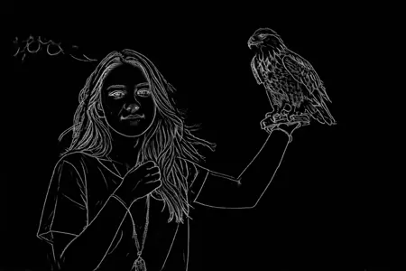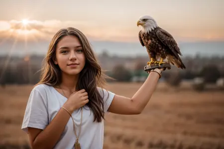 プロンプト: 立っている、ワシが彼女の腕の上に立っている