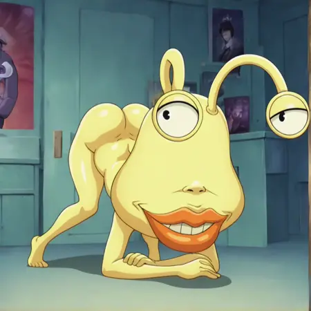 Ojama_Yellow, humanoid, big head, yellow skin, eyestalks, thick orange lips, nose, fat, thin legs, thin arms, red thong, floral print, underwear only