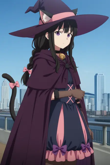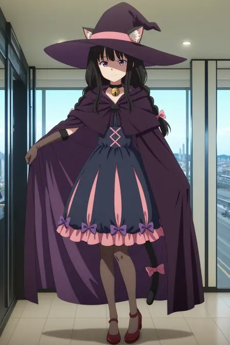 inutnk, long hair, black hair, twin braids, hair bow, low-tied long hair, long sidelocks, choppy bangs, purple eyes, halter dress, see-through clothes, neck bell, two-tone dress, blue dress, pink dress, dress bow, purple cloak, hooded cloak, brown gloves, elbow gloves, fur-trimmed gloves, cat tail, tail bow, brown pantyhose, red shoes, strappy heels, witch hat, purple hat, hat with ears