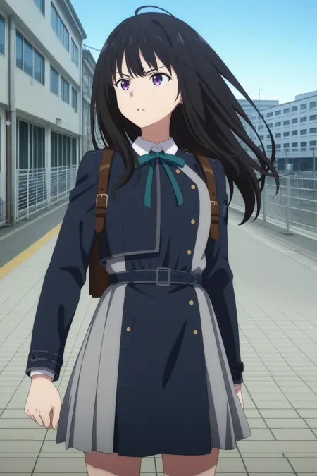 inutnk, long hair, black hair, choppy bangs, purple eyes, long sleeves, two-tone dress, blue dress, grey dress, aqua ribbon, neck ribbon, blue belt, wristwatch, backpack, black socks, kneehighs, brown shoes, loafers