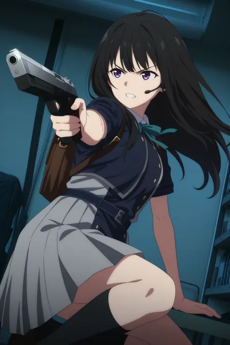inutnk, long hair, black hair, choppy bangs, purple eyes, short sleeves, two-tone dress, blue dress, grey dress, aqua ribbon, neck ribbon, blue belt, wristwatch, backpack, black socks, kneehighs, brown shoes, loafers
