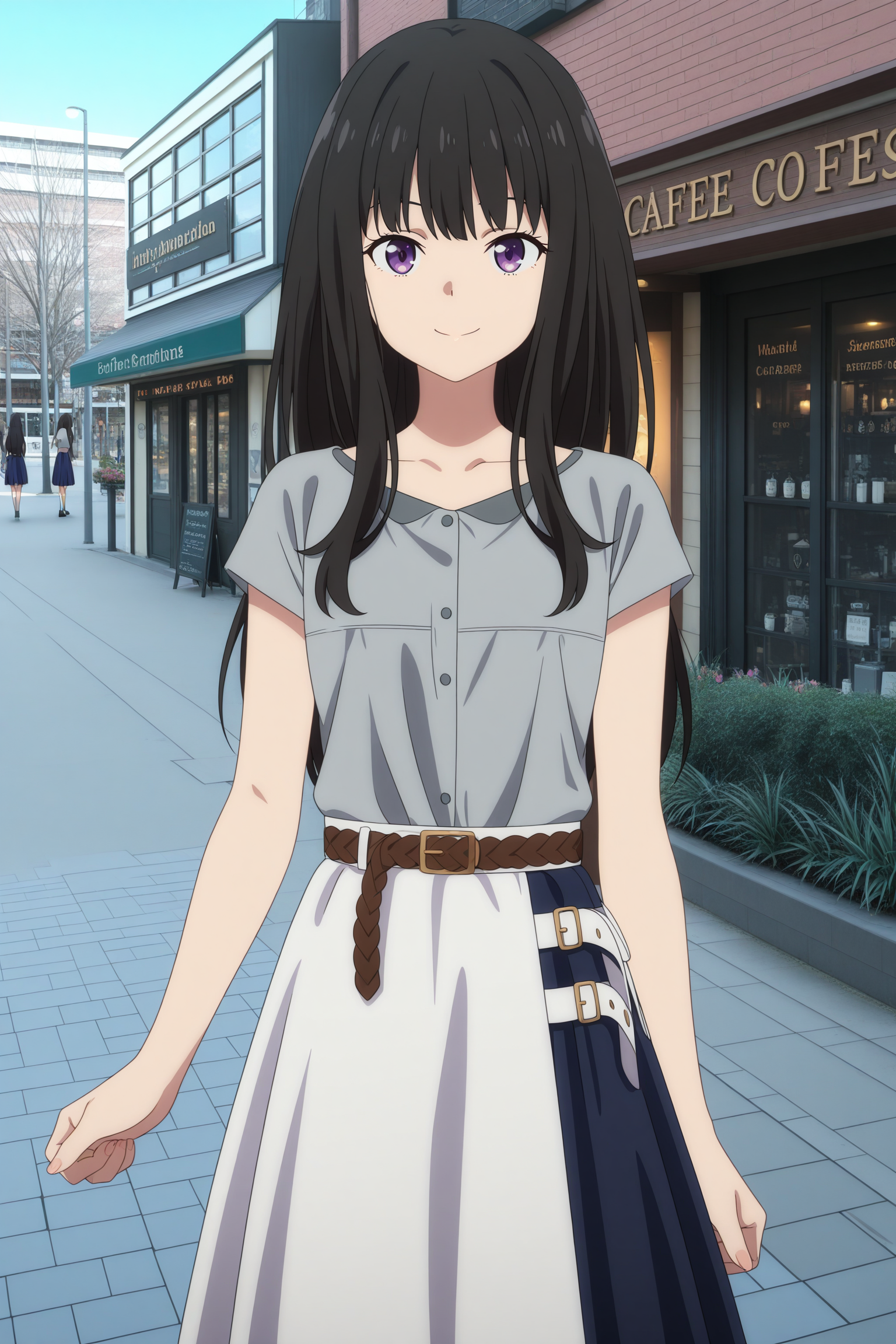 inutnk, long hair, black hair, choppy bangs, purple eyes, short sleeves, grey shirt, brown belt, two-tone skirt, white belt, white skirt, blue skirt, grey socks, ankle socks, black shoes, low block heels