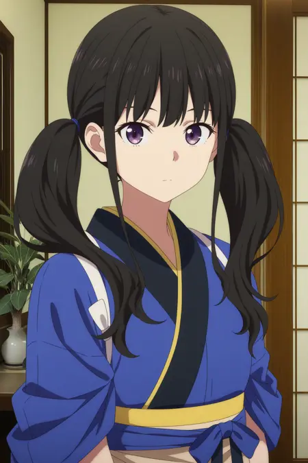 inutnk, long hair, black hair, twintails, hair tie, sidelocks, choppy bangs, purple eyes, sleeves rolled up, blue kimono, tasuki, brown apron, waist apron, waist ribbon, blue skirt, tabi, zouri