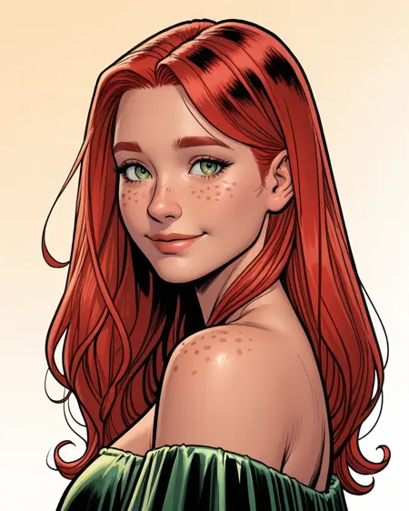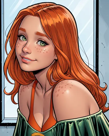 Triggers: maxineh, red hair or orange hair, freckles, green eyes, dress, off shoulder, striped thighhighs,