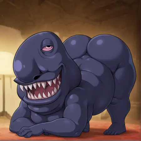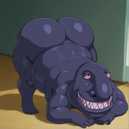 Ojama_Black, humanoid, purple body, big head, big nose, pink sclera, fat, belly, moobs, fat legs, fangs, red thong, floral print, underwear only