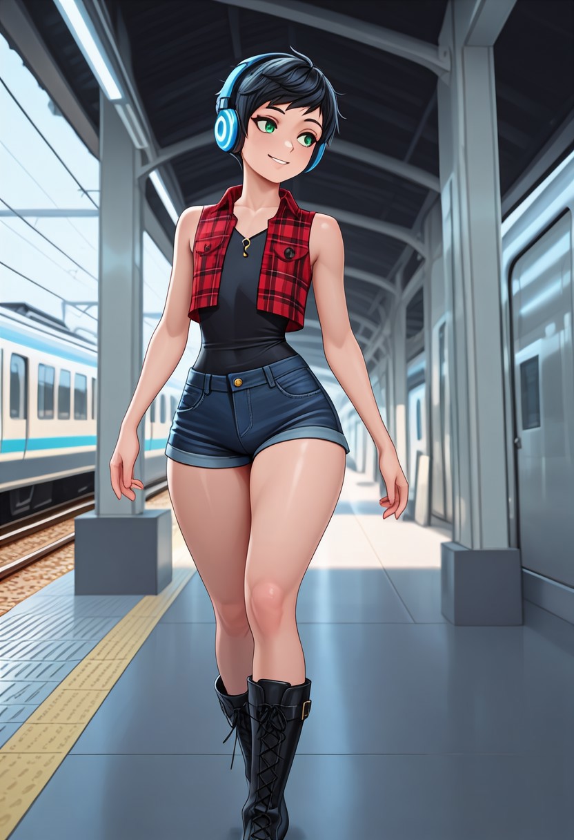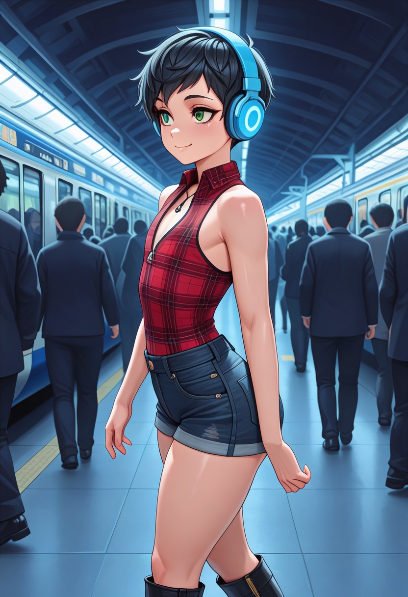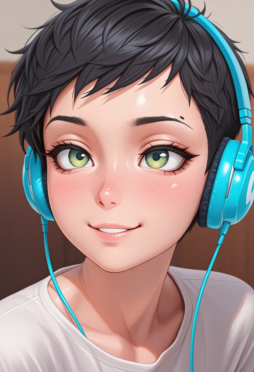 1boy, femboy, solo, D4nielS-IL, light skinned femboy, black hair, very short hair, pixie cut hair, eyebrow straight, green eyes, sexy body, small penis, small testicles,