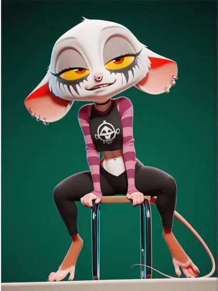 彼女は、コントーションをしながらビルリ・イレイッシュの曲を歌うターセイです。彼女の外見は不気味で、おそらくシーン系(ゴス、エモ、パンクロッカー)です。