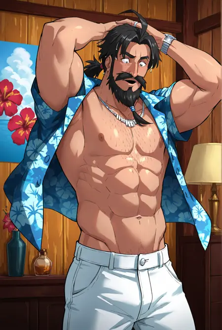 3dward teach, facial hair, beard, black hair, mustache, ahoge