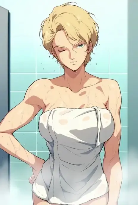 LilaMillaRira, short hair, blonde hair, green eyes, lipstick, pink lips, large breasts,