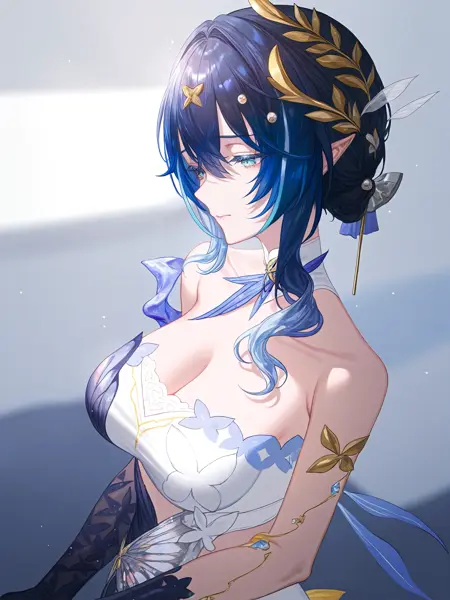 프롬프트: Katya klein, Katya klein-Rhapsody_(Floral Flutter), 코의 흉터, 파란 머리, 다채로운 머리, 검은 머리, 청록색 눈, 뾰족한 귀, 머리 장식,