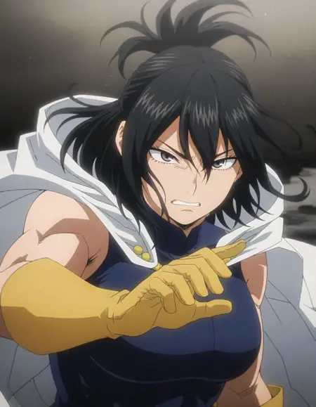 1girl, shimura nana, muscular female, blue bodysuit, white cape, yellow gloves, yellow boots, red loincloth, black eyes,