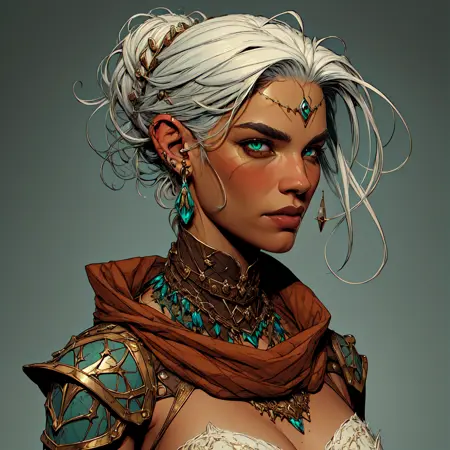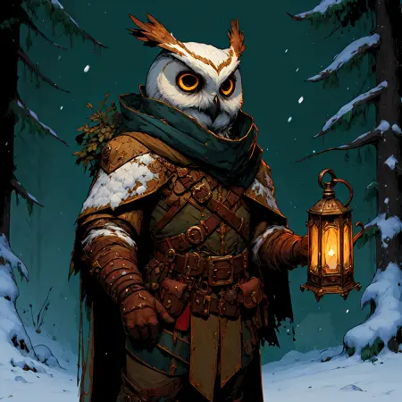 这个LoRA捕捉了桌面角色扮演游戏角色艺术的丰富氛围美学,采用绘画笔触和电影般的光影效果。