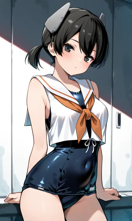 | 训练词汇 | I41KC, short ponytail, black hair,white shirt, crop top, sleeveless shirt, covered navel, headgear, white sailor collar, blue one-piece swimsuit, sailor shirt, swimsuit under clothes, old school swimsuit, orange sailor collar, side-tie shirt, brown neckerchief,已复制! |