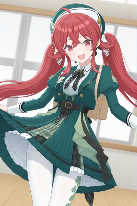 服装:kaho-akogareha-mousukoshi,绿色贝雷帽,绿色连衣裙,绿色短款夹克,白色衬衫,朱丽叶袖,百褶裙,格纹,白色连裤袜,三叶草图案连裤袜,黑色丝带,黑色乐福鞋,背包