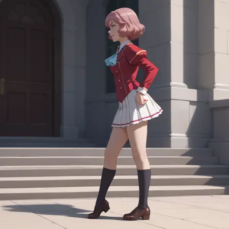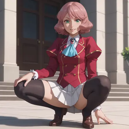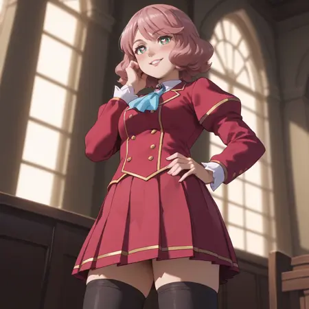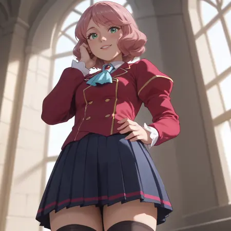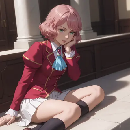 ジャケット、ロングスリーブ、赤いジャケット、ブローチ、学校制服、スカート、ジュエリー、宝石、白いスカート、アスコット、リボン、黒いレッグウェア、プリーツスカート、白いシャツ、ニーソックス、制服、ボタン、ふわふわのスリーブ、青いリボン、