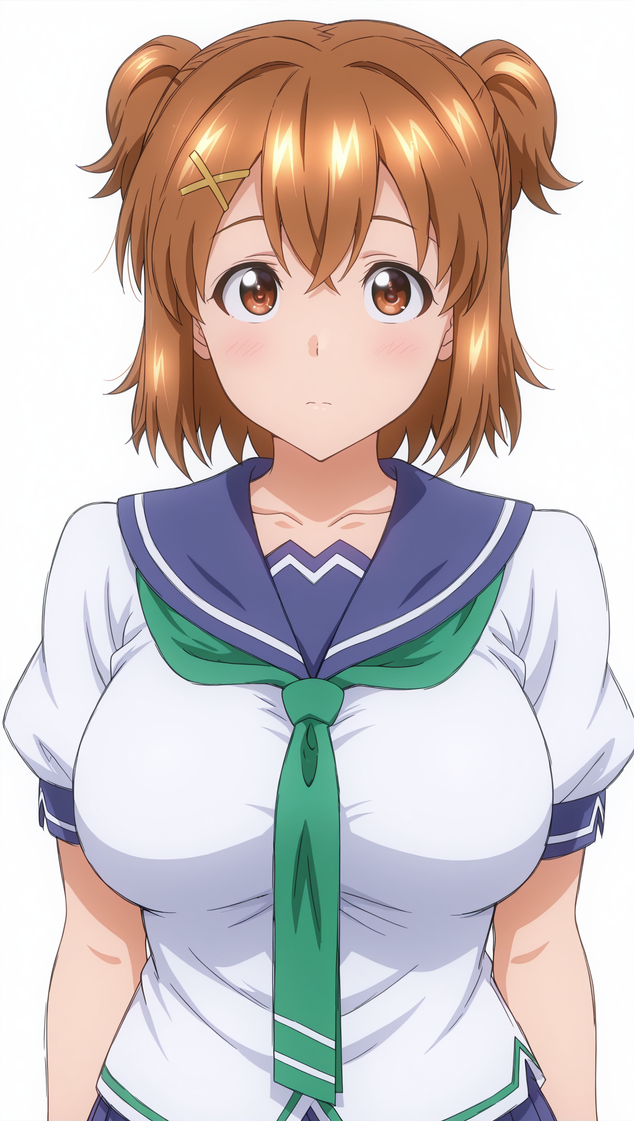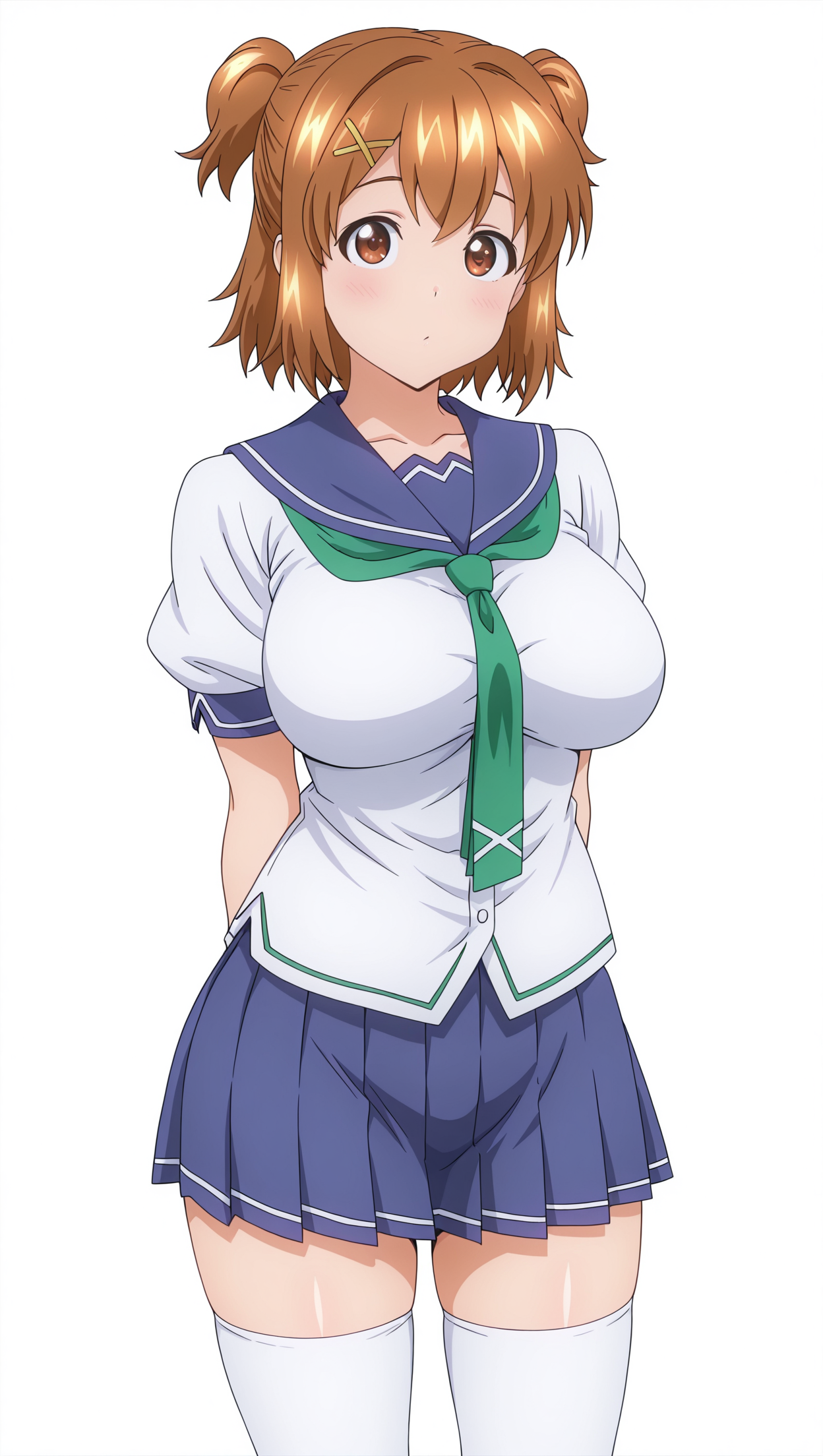 anime coloring, masterpiece, best quality, amazing quality, inahokushiya, 1girl, short hair, brown hair, brown eyes, big breasts, x hair ornament, neckerchief, green neckerchief, shirt, short sleeves, skirt, blue skirt, thighhighs, white thighhighs, solo, pose, standing, looking at viewer, from front, ((((white background, simple background))))