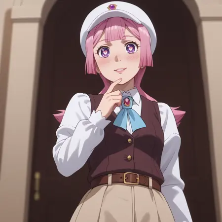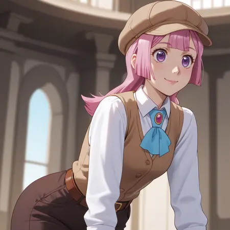 AnnaVest, 셔츠, 모자, 흰색 셔츠, 짧은 머리, 리본, 빨간 리본, 조끼, 칼라 셔츠, 캐비 헤드폰, 벨트, 긴 소매, 비니, 갈색 바지, 갈색 조끼,