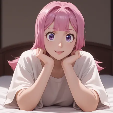 ARTAnna, 분홍색 머리, 긴 머리, 앞머리, 보라색 눈, 둔한 앞머리, 머리카락으로 보이는 눈썹, 머리카락이 들어간,