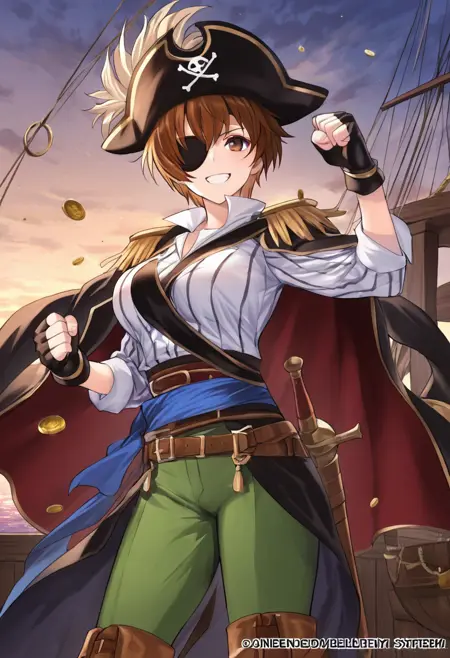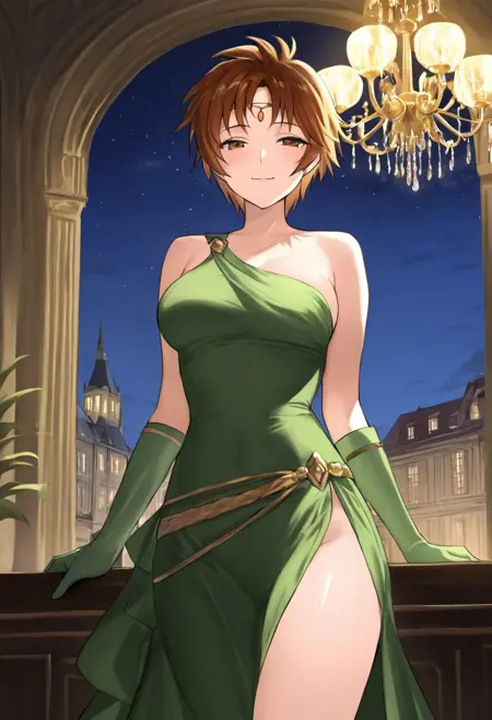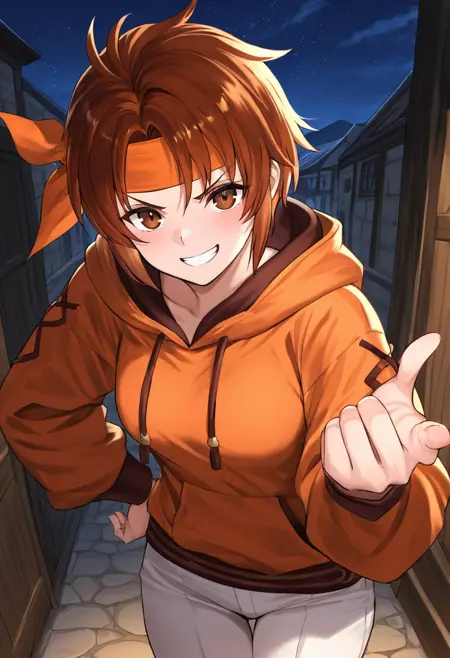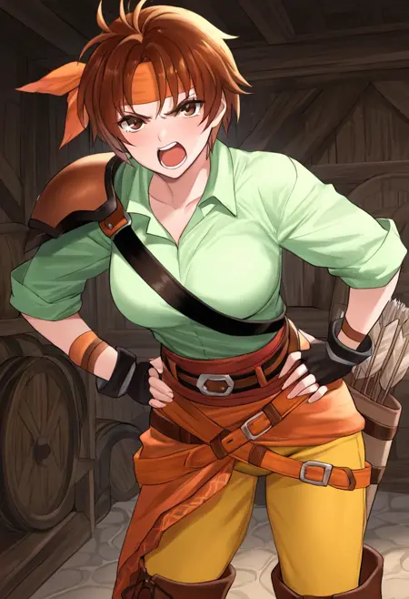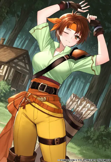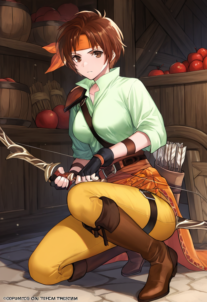 트리거 단어: TanyaFE, 갈색 머리, 단발, 주황색 헤드밴드, 갈색 눈, 칼라 셔츠, 연한 녹색 셔츠, 짧은 소매, 한쪽 어깨 패드, 어깨 벨트, 손가락 없는 장갑, 벨트, 허리 스카프, 주황색 스카프, 노란색 바지, 화살통, 허벅지 스트랩, 무릎 부츠, 갈색 부츠