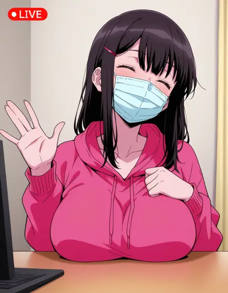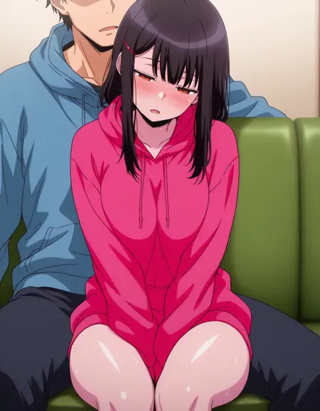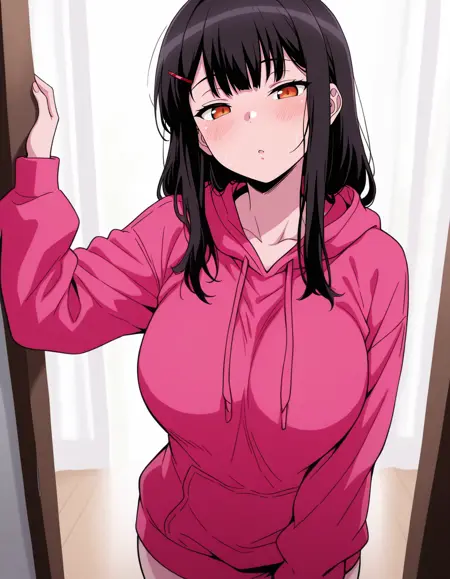 mai_mta,mai_aimta,long_hair,black_hair,orange_eyes,hair_ornament,hairclip,large_breasts,pink_hoodie,long_sleeves,hooded_sweater,pleated_skirt,black_skirt,socks,loafers