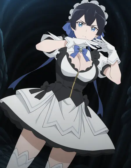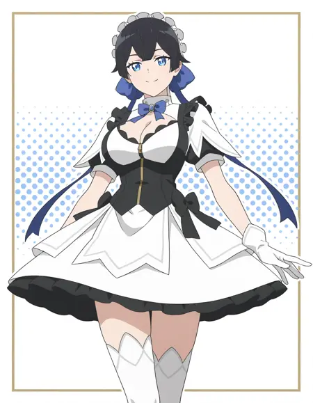 She has short, dark hair styled neatly like a dedicated battle maid, along with bright blue eyes that occasionally reveal a mystical glow when she activates her abilities. Her figure is slim yet toned, reflecting her agility and precision on the battlefield.
