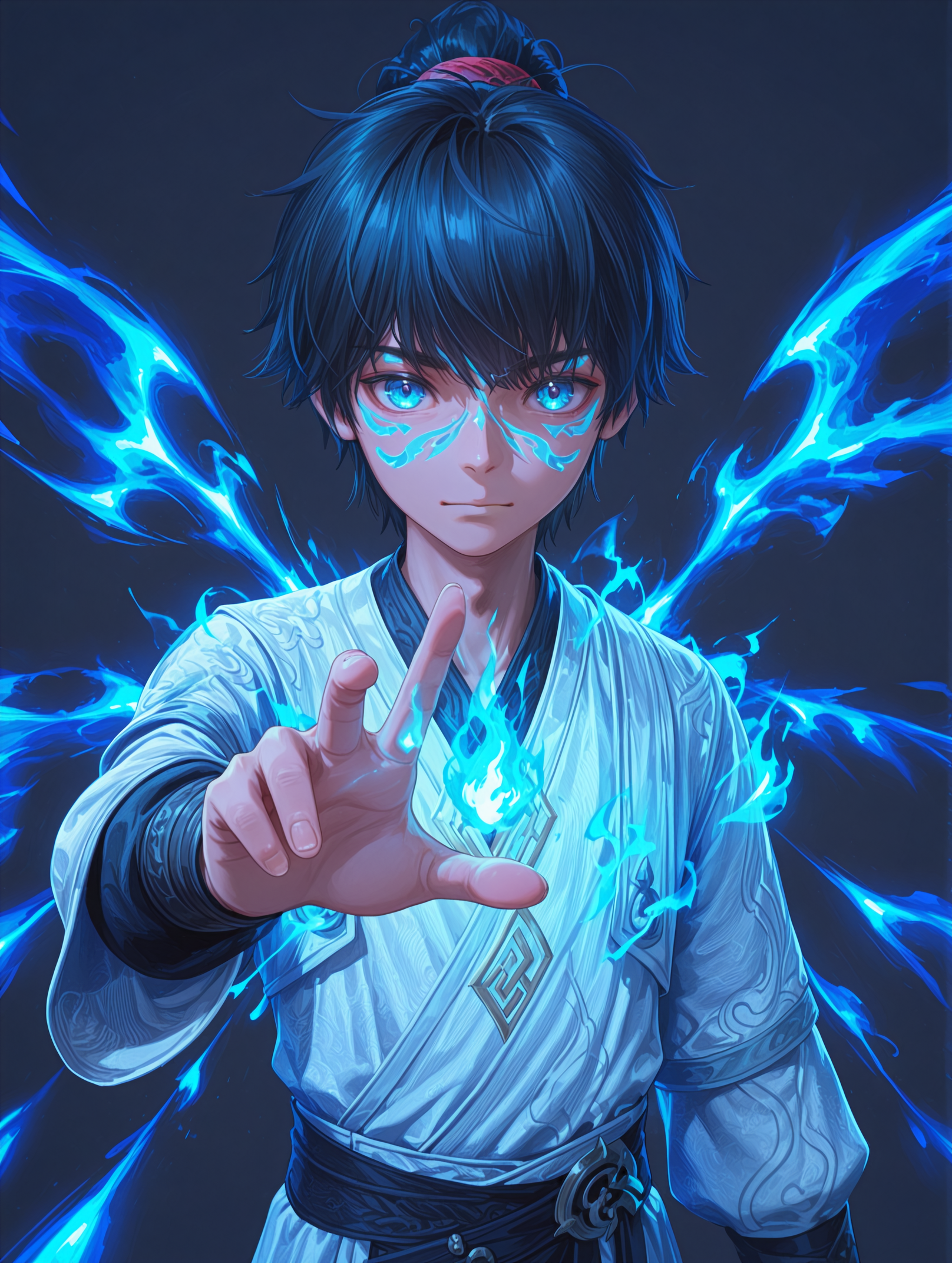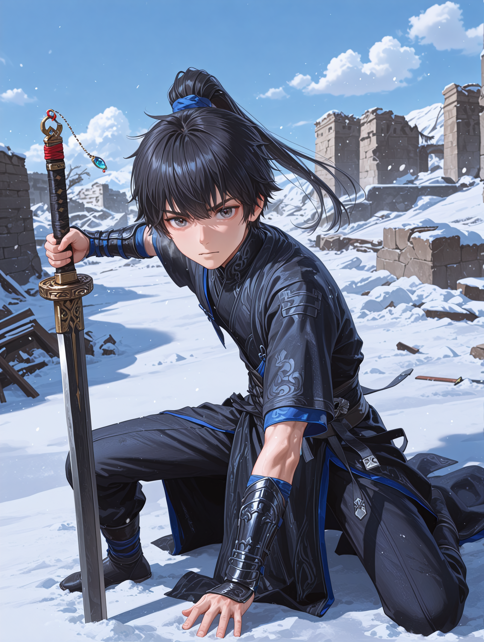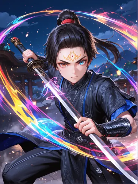 プロンプト:1boy,xiaomengchuan,black hair,high ponytail,brown eyes,