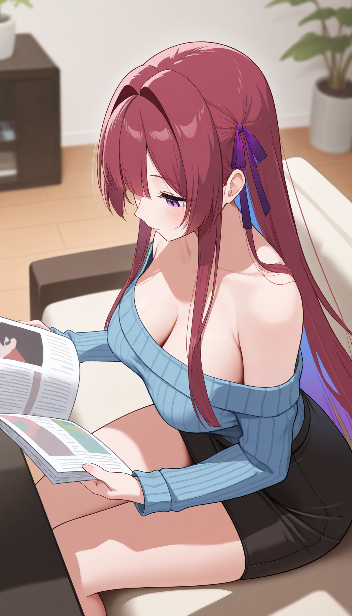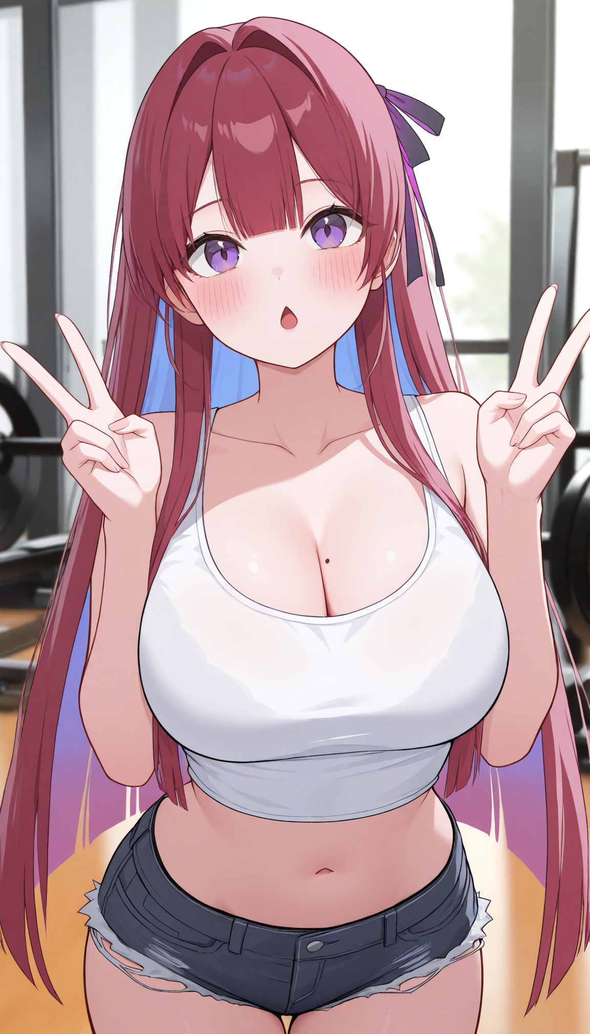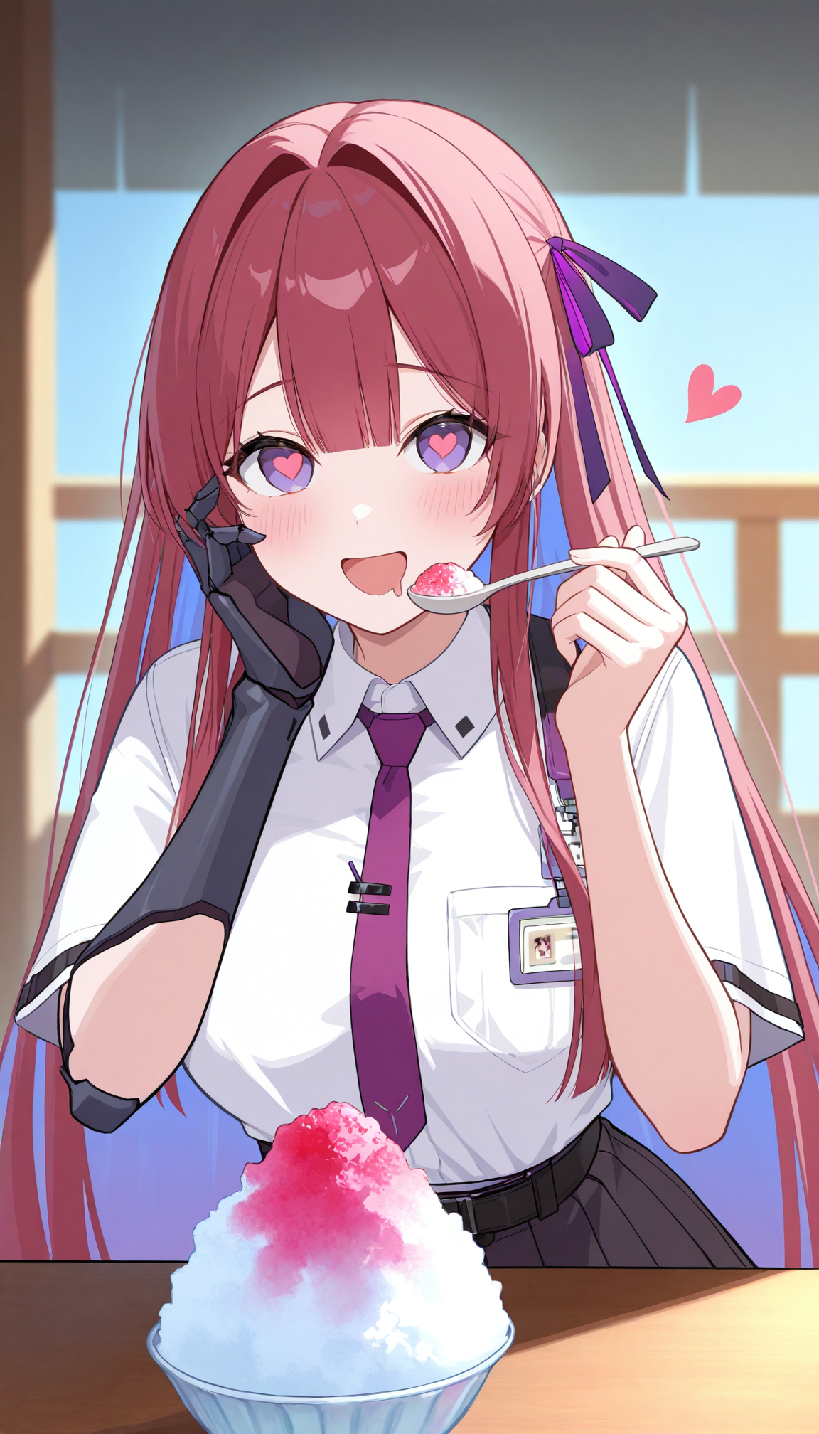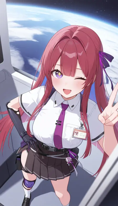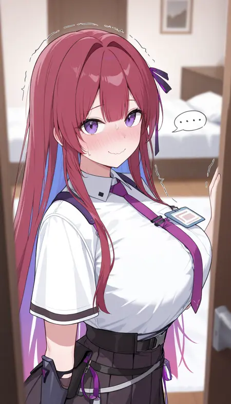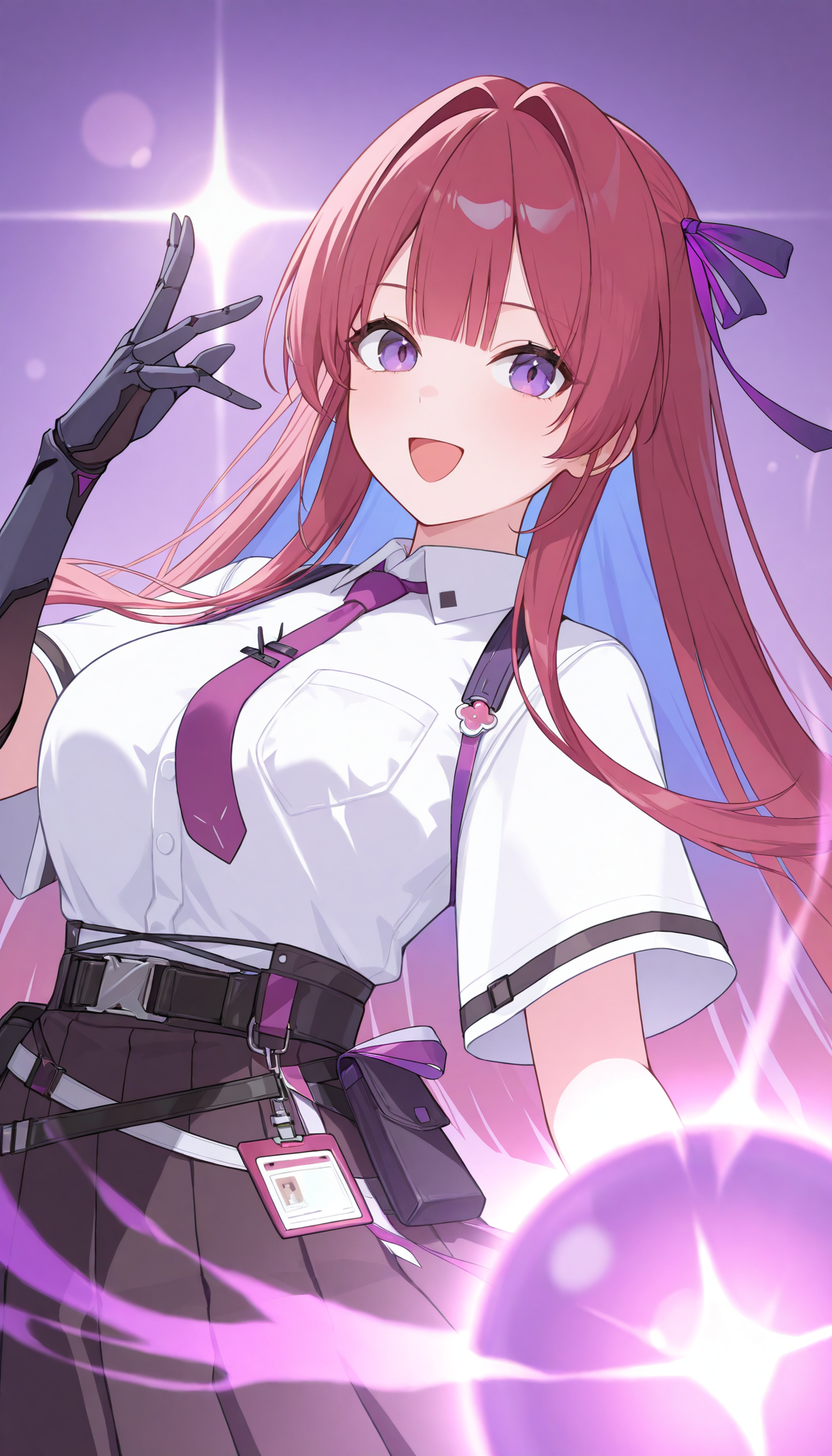 | トレーニングワード | r31czn, purple eyes, two-tone hair, long hair, red hair, colored inner hair, purple hair, hair intakes, blunt bangs, sidelocks, hair ribbon, purple ribbon, white shirt, collared shirt, chest harness, breast pocket, purple necktie, tie clip, id card, short sleeves, single mechanical arm, black belt, belt buckle, multiple belts, crossed belts, shirt tucked in, high-waist skirt, black skirt, pleated skirt, side slit, single thigh strap, thigh holster, thigh pouch, single knee pad,コピーしました! symbol-shaped pupils,コピーしました! |