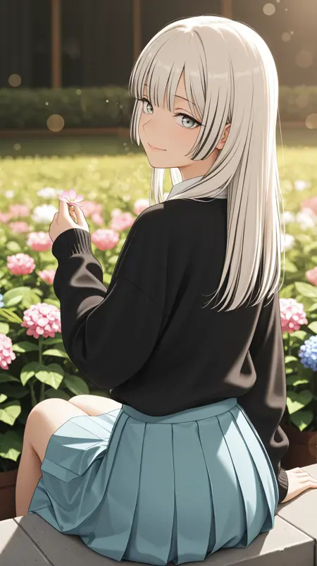 seira_kasai, long hair, white hair, streaked hair, multicolored hair, black streaks, grey eyes, blunt bangs, white collared shirt, black sweater, blue school uniform jacket, light blue skirt, pleated skirt,