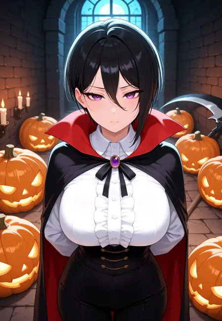 r_yashio, purple eyes, black hair, short hair, hair between eyes, asymmetrical hair, large breasts