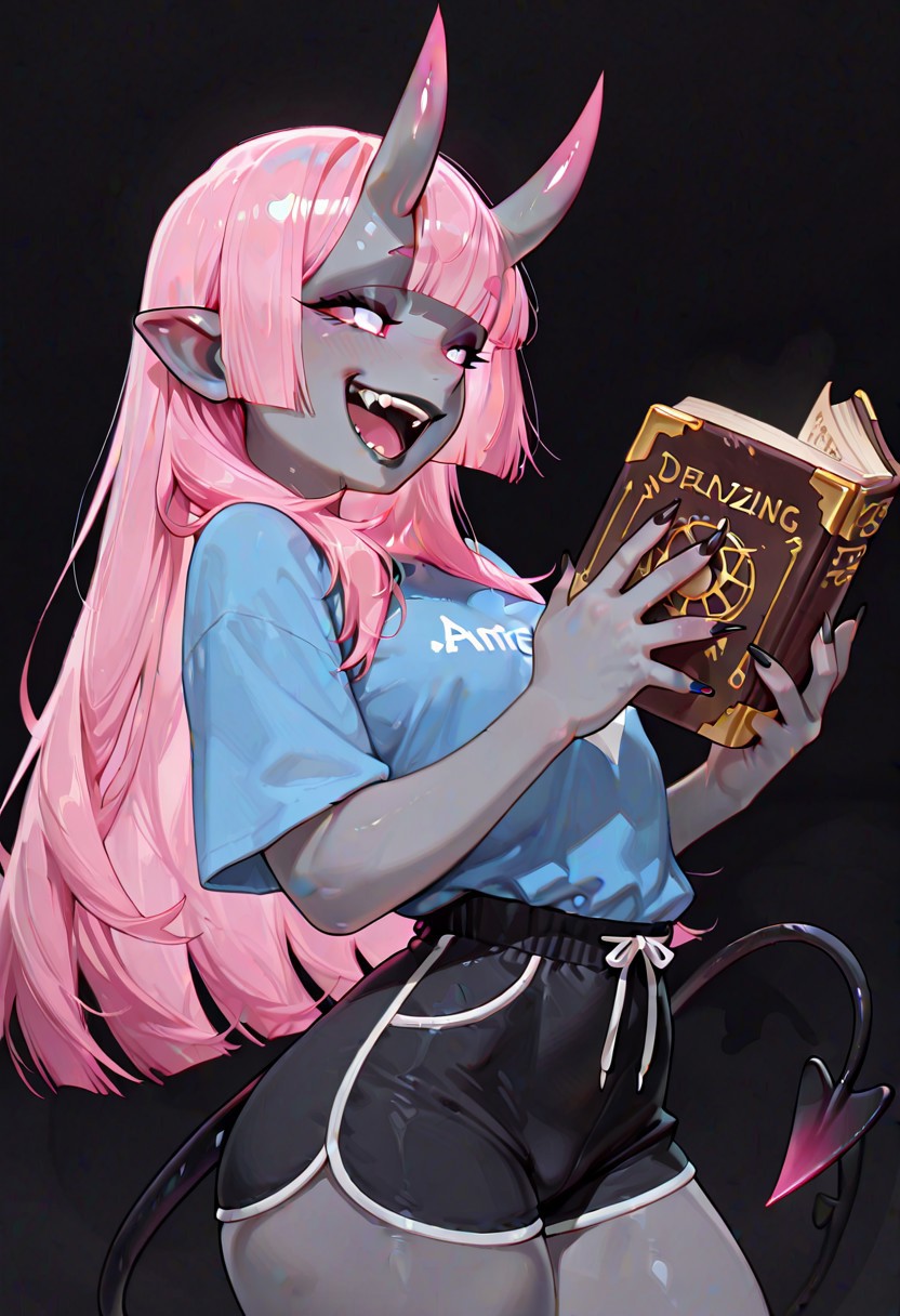 1girl, demon girl, black oni horns, long pink hair, blunt bangs, pink sclera, white eyes, black lips, grey skin, long pointy ears, demon tail, long sharp black fingernails,