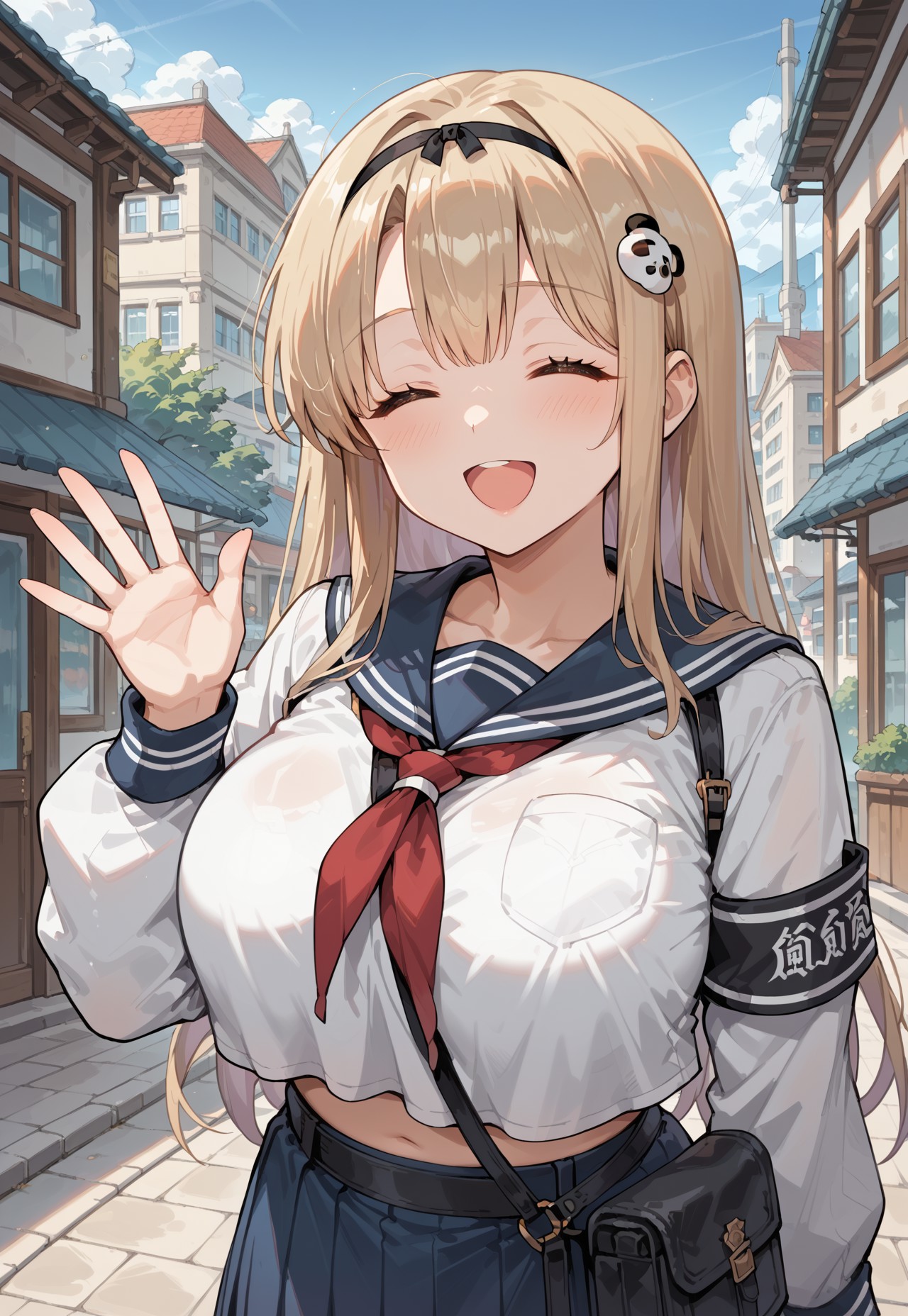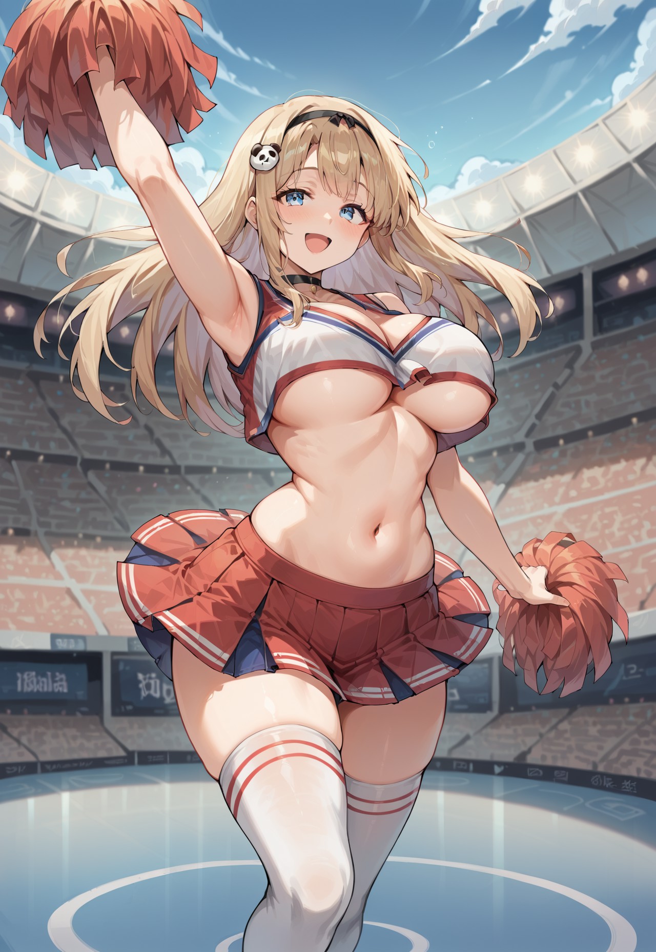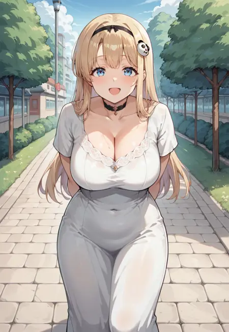 Haru_CZN, 金发, 长发, 刘海, 蓝眼, 熊猫发夹, 黑色发带, 曲线身材, 大胸, 宽臀, 厚腿,