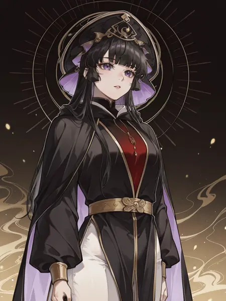 服装:黑色斗篷,黑色长袍,骨盆帘,黄色腰带,红色上衣,白色长裤