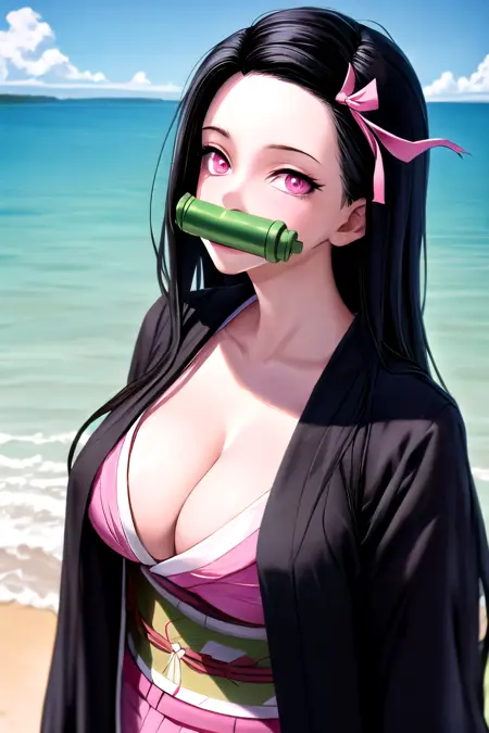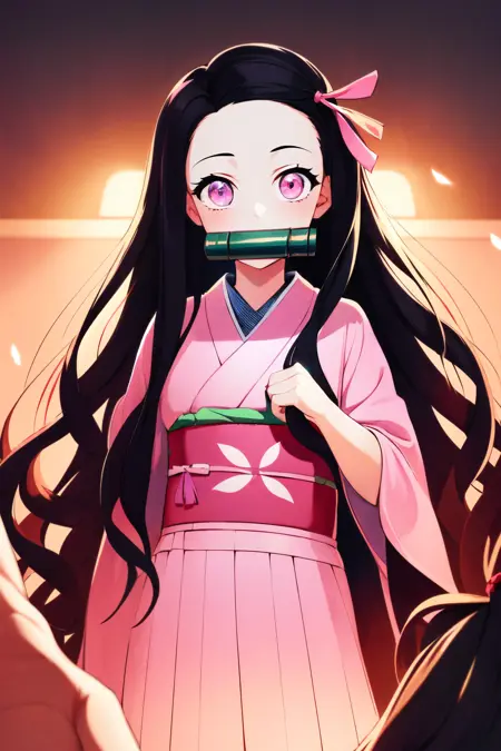 ねずこ、1girl、ピンクの目、長い髪、ピンクの着物、ツートーンヘア、リボン