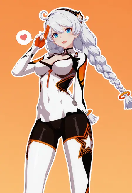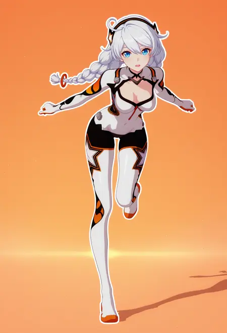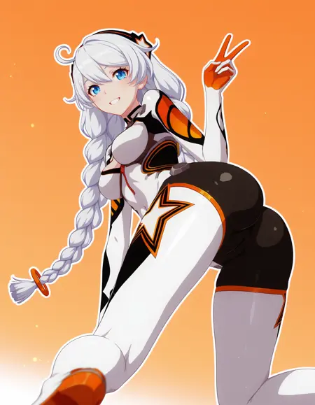 「kianawc3d」「3d」「キアナ・カスラナ」「キアナ・カスラナ \(白練\)」「白髪」「青い目」「白いボディスーツ」「ロングヘア」「ツインブレード」「前髪」「ヘッドバンド」「胸元の切り替え」「ボディスーツで腕と手がカバーされている」「黒いボディスーツの股部分」「太ももがカバーされている」「タイツ付きボディスーツ」「ボディスーツにプリントされた黒いショーツ」「黒いトリム」「胸」「へそがカバーされている」「グローブ」「ラテックスボディスーツ」