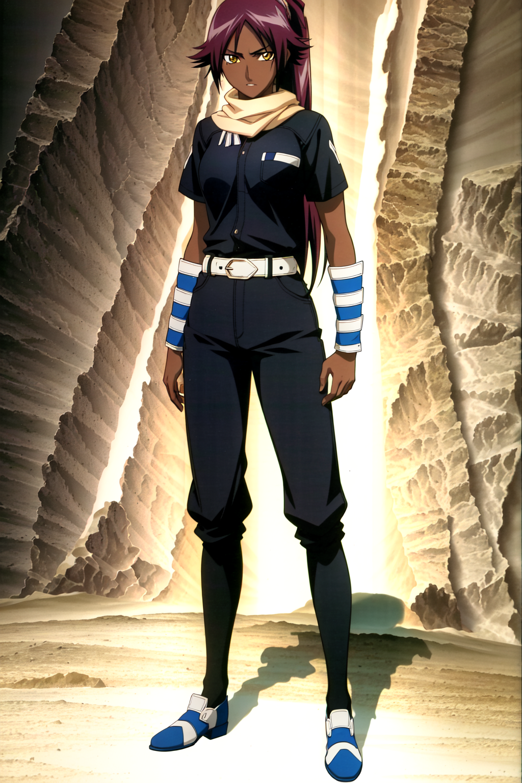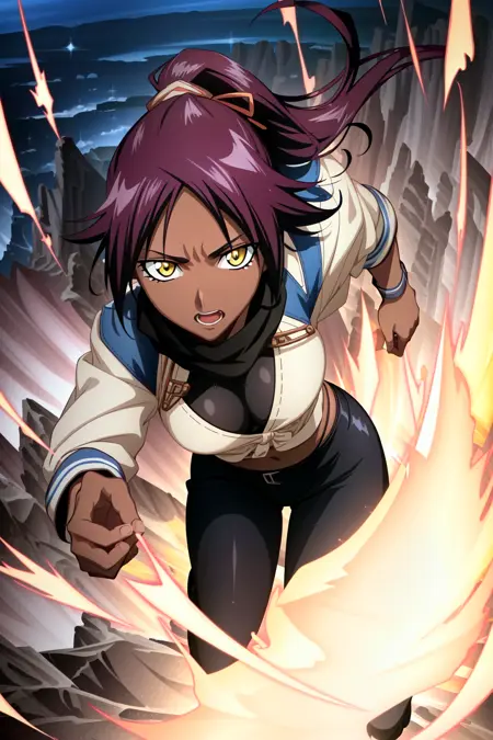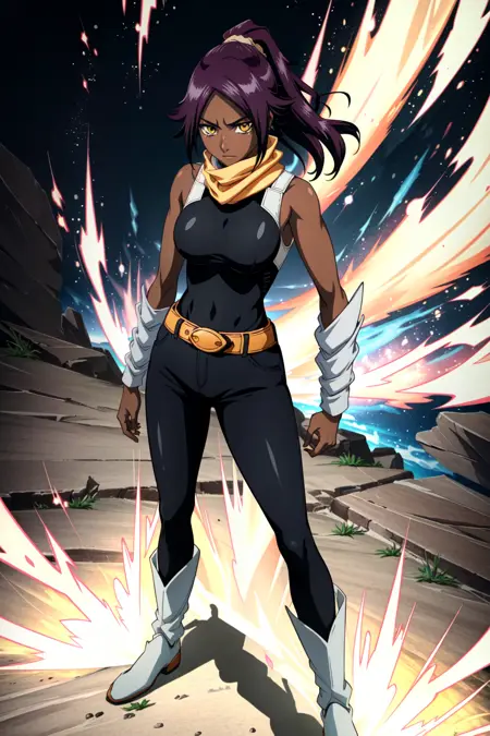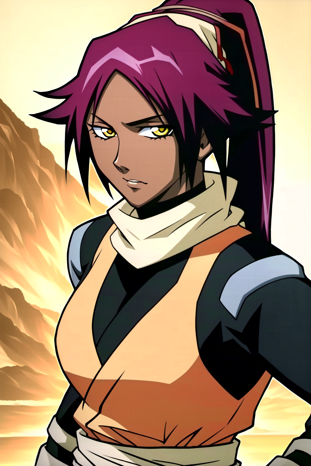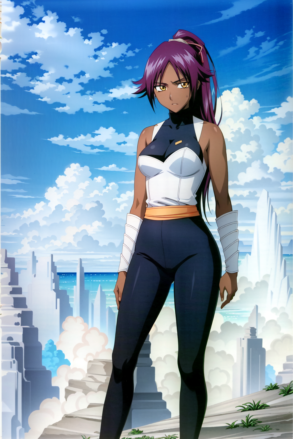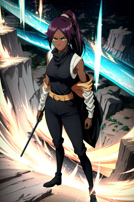 Yoruichi Shihouin、暗色肌の女性、中程度の胸、暗い肌、紫の髪、ポニーテール、長い髪、黄色い目