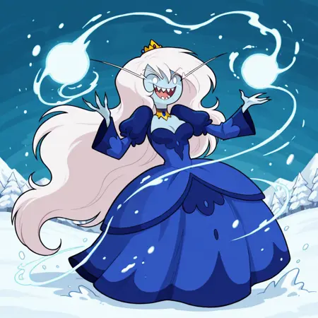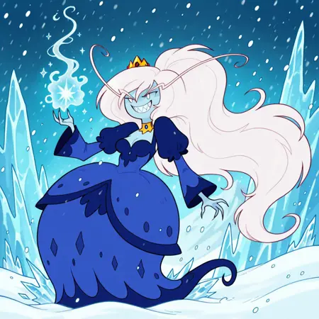 monster female, solo, light blue skin, solid white eyes, white void eyes, very long white hair, very long white eyebrows, no nose, noseless, sharp teeth, four fingers, long nails, gold choker, gold crown with rubies, curvy, breasts, large blue dress with dark blue accents, puffy shoulders,