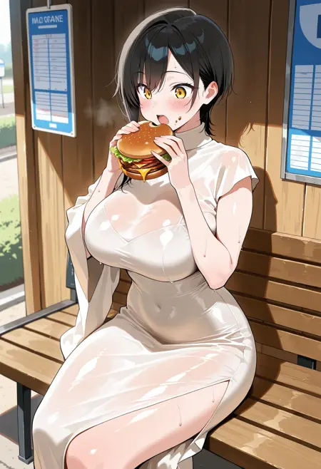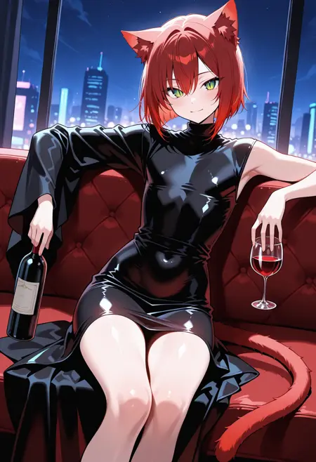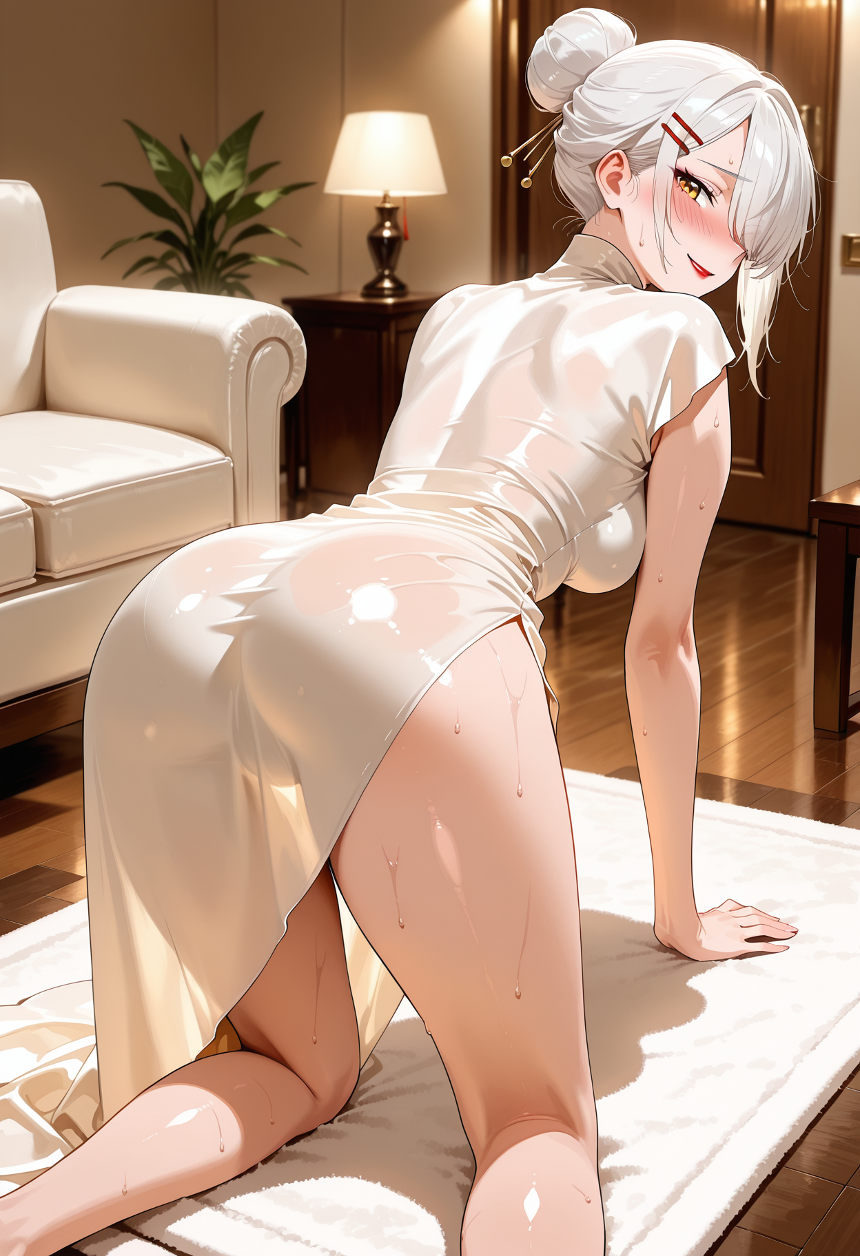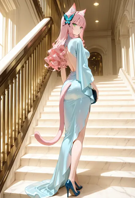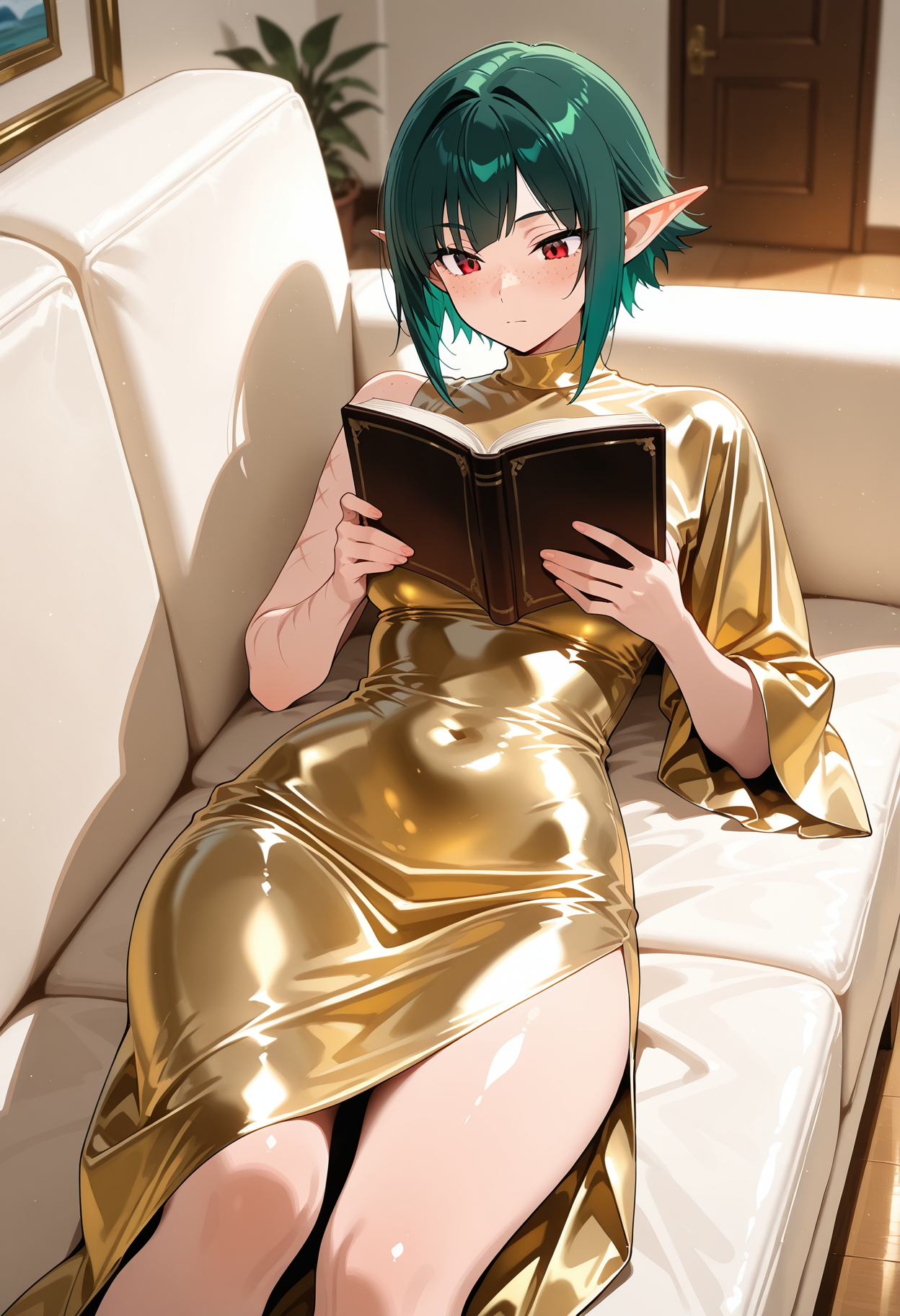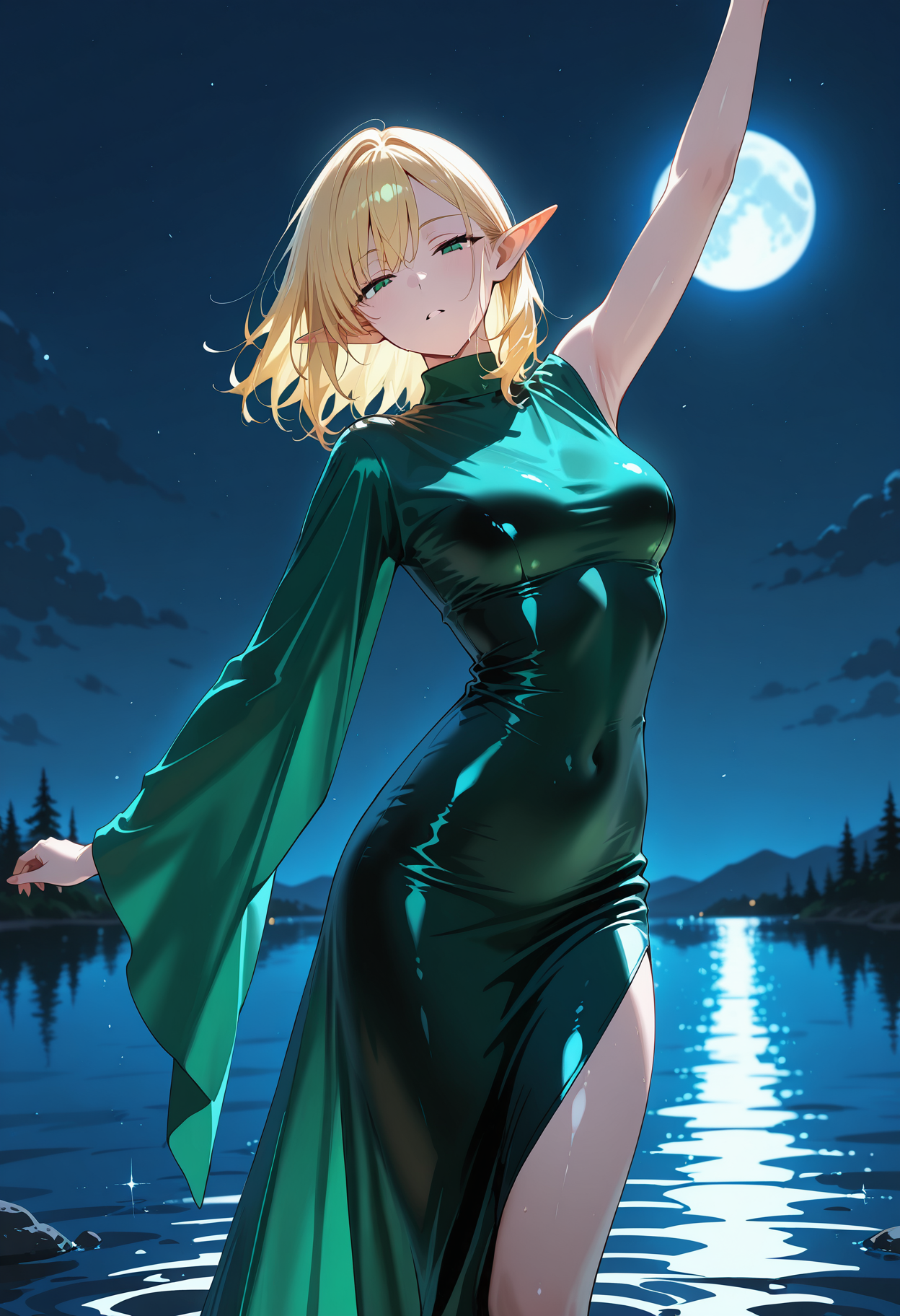 触发词:长裙、不对称裙摆、不对称袖子、缎面连衣裙、闪亮连衣裙、单袖连衣裙、长袖、宽袖、高领、遮肩